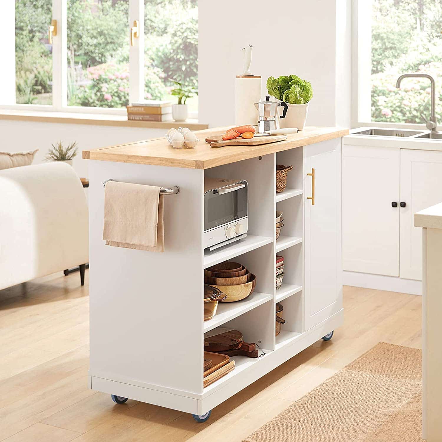 Fritstående køkkenø Udformet i skandinavisk design med rene, enkle linjer. Bordplade i tykt hevea finertræ, et slidstærkt naturmateriale, der kan slibes og overfladebehandles efter behov. Træfiner giver dig samme udtryk, følelse og skønhed som massivt træ