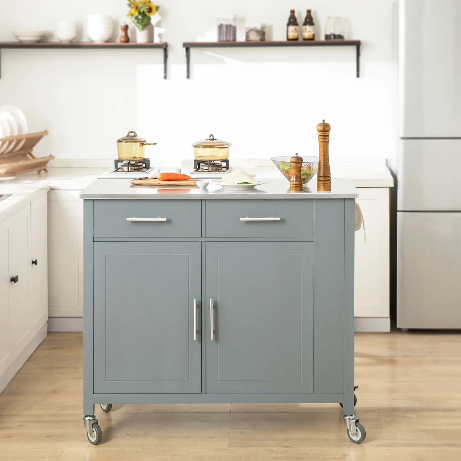 Fritstående køkkenø med bordplade i rustfrit stål Denne elegante køkkenø har en smuk bordplade i rustfrit stål, der med sin glatte og hårde overflade er både slidstærk og let at rengøre. Designet er inspireret af skandinavisk minimalisme med rene, enkle l