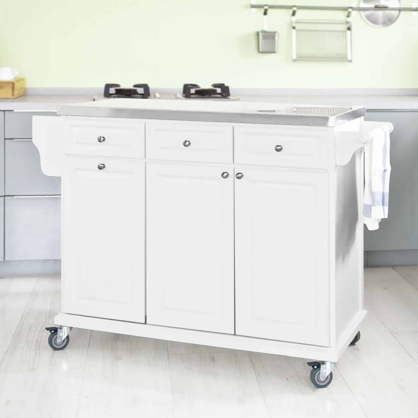 KøkkenøÂ med stålbordplade Rummelig og robust. Smuk køkkenø i høj kvalitet. Udstyret med 3 skuffer og et stort skab med tre døre. Den rustfri stålplade matcher det hvide træ perfekt. Køkkenøen har hjul og er derfor let at flytte på enhver overflade. Ideel