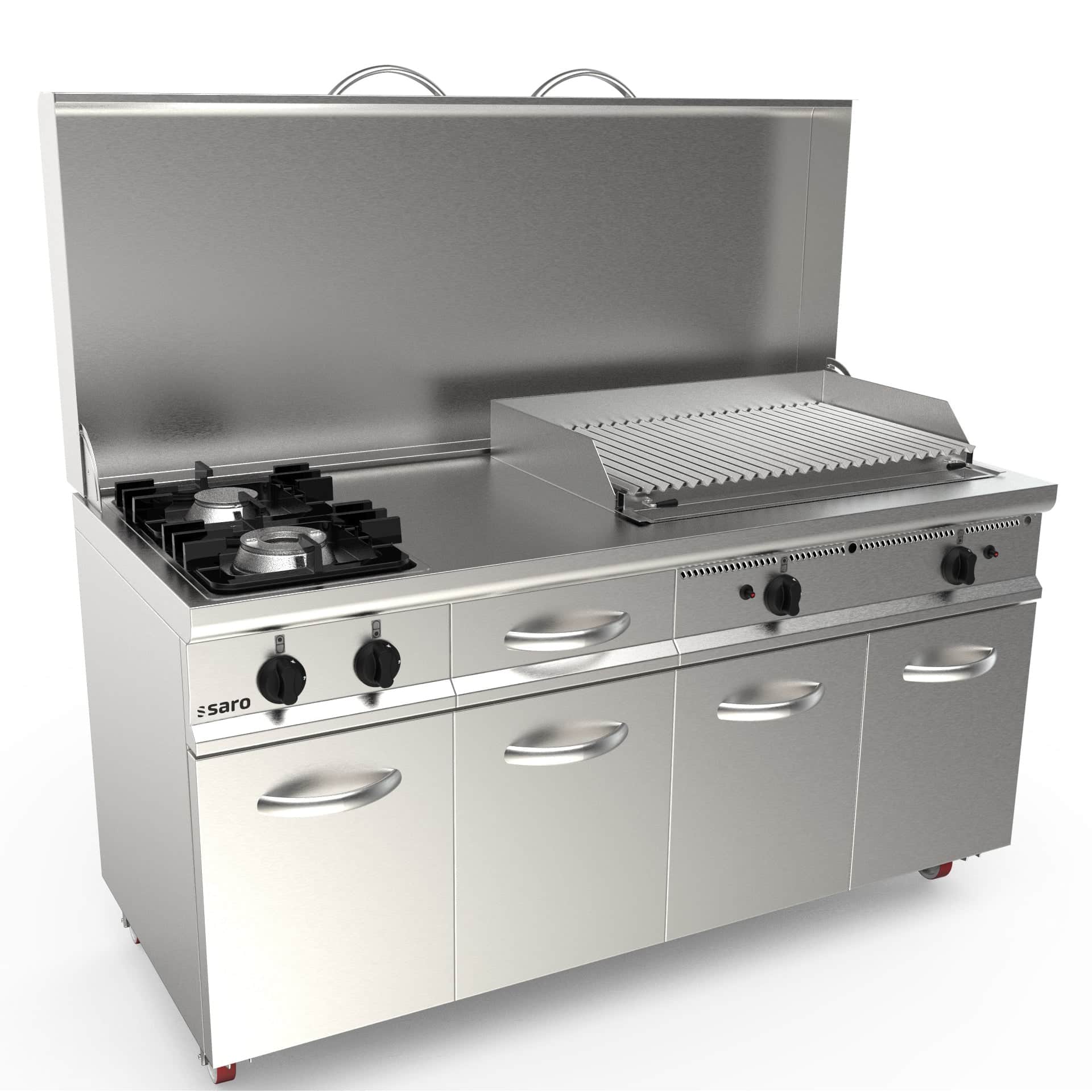 Materiale: (kabinet) rustfrit stål, (Grydestøtter) Støbejern⢠Mobil kogeø, med 2 brændere og lavastensgrill (rillet), til individuel madlavning og stegning⢠1 skuffe, 4 opbevaringsrum⢠4 hjul, 2 bremsede⢠Temperaturområde: Max. 850 °C⢠Brændere
