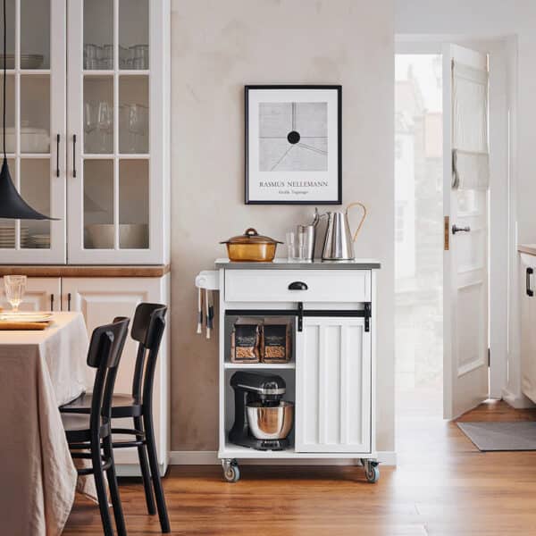 Smart serveringsvogn / køkkenø i industrielt look, stålbordplade, L69xB46xH92cm, hvid